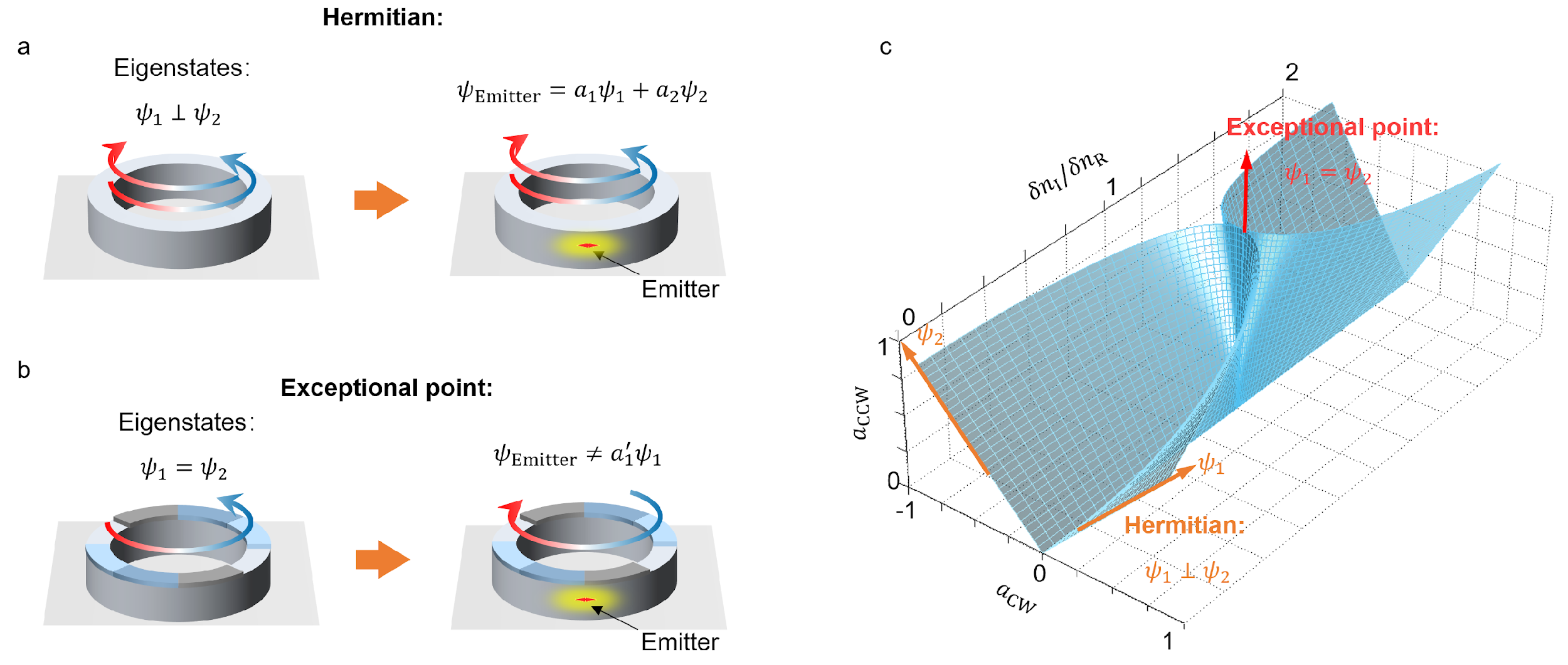 图1(a)普通环形谐振腔在一共振频率下有两个正交的本征态,处于共振频率的光源与其相互作用会同时激发出这两个本征态。(b)处于奇异点,共振频率上只存在一个逆时针传播本征态的环形谐振腔。处于共振频率的光源与其相互作用激发出了体系中不存在的顺时针传播的本征态。(c)环形谐振腔中本征态随着时间-宇称对称折射率调制的演化。在奇异点处两个本征态是完全平行的。 |