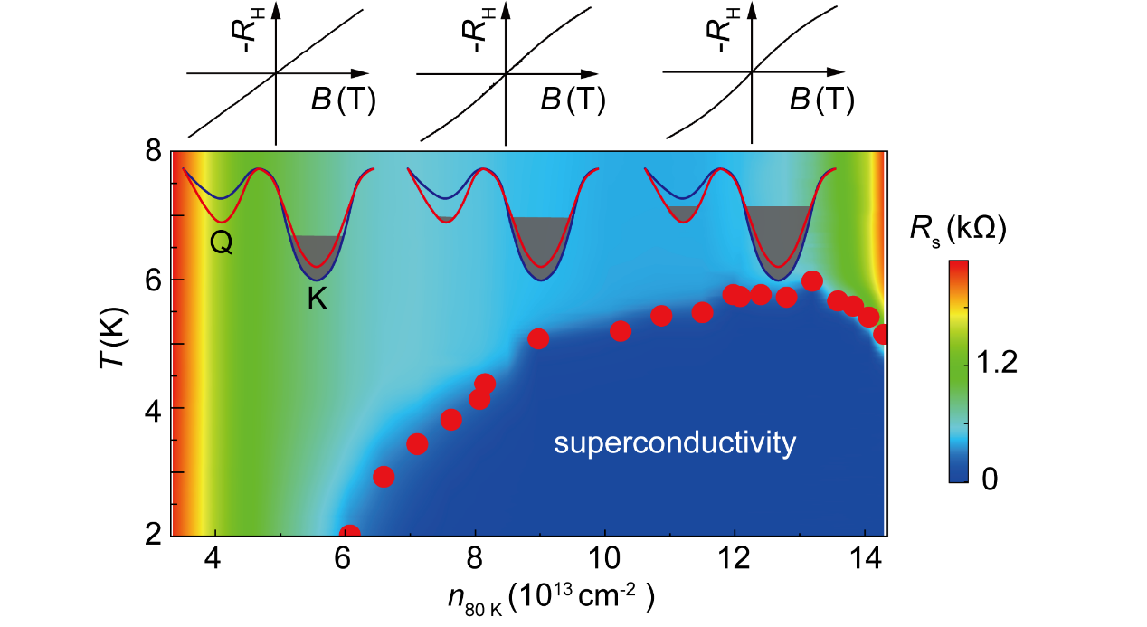 当体系中载流子掺杂超过约6 E13 cm−2时,低温下开始出现超导,而得益于无序度较低的高质量异质结器件,垂直磁场下同时也观测到了明显的非线性霍尔效应,这种非线性霍尔效应可以利用双载流子模型很好地拟合,在排除了反常霍尔效应和载流子的不均匀等原因后,结合第一性原理计算发现这一附加的高迁移率导电通道来源于Q能谷被占据。这种Q能谷被占据和超导的强关联行为也从超导临界磁场随温度的变化关系中得以佐证。