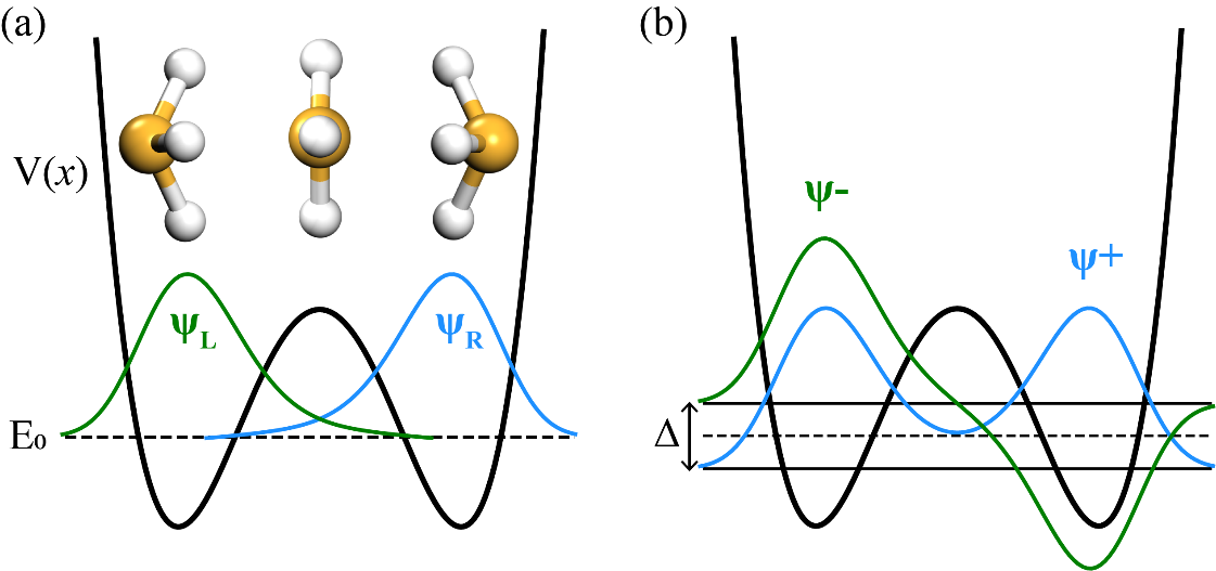 以氨分子这样一个最为常见的伞状分子为例,原子核内在的量子效应实际上是允许其在两个对称态之间隧穿进而叠加的(图一a)。与之相应,分子能级也会发生劈裂(图一b)。实际上,早在1929年,量子力学基本原理刚刚建立的时候,R. G. Dickinson等人就在气态氨的光谱中观察到几十个波数的劈裂信号(Phys. Rev. 34, 582 (1929))。1932年,D. M. Dennison与G. E. Uhlenbeck合作,利用简单的Wentzel–Kramers–Brillouin (WKB)方法,计算出了氨分子的结构信息:N-H键长约为1.02埃,H-H距离约为1.64埃(Phys. Rev. 41, 313 (1932))。在当时的量子化学刚刚起步以及实验技术存在诸多限制的条件下,这是一个惊人的精度(对比现代结果1.012埃和1.624埃)。这个现象背后的物理是如此的深刻,以至于1972年当P. W. Anderson在其著名文章《More is different》中谈及对称性的时候,也将其作为最典型的例子进行了长篇的讨论(Science 177, 393 (1972))。现在,人们已经广为接受这样一个概念,并将其作为一个基本知识放入《量子力学》、《物理化学》这种基础课程中。前沿研究中,分子团簇的隧穿谱测量也取得了巨大的成功(比如新型激光与同步加速器光谱的技术,详见Science 257,1937 (1992);Science 271, 59 (1996);Science 271, 62 (1996);Science 351, 1310 (2016)等)。但与之形成鲜明对比的,是在计算模拟中由于此量子过程的高维特性,精确的计算方法还很稀缺。