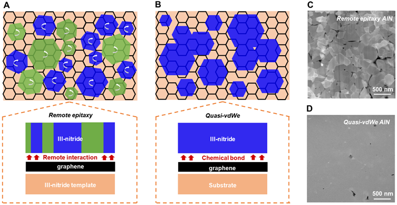 图2. 单晶graphene上氮化物半导体外延生长模型:A,氮化物半导体远程外延模型。B, 氮化物半导体准范德华外延模型。C,通过远程外延在1-ML graphene/AlN(0001)模板上制备AlN薄膜的HAADF-STEM图。由于面内取向的显著差异,远程外延AlN晶粒无法聚并形成单晶薄膜。D,通过准范德华外延在3-MLgraphene/AlN(0001)模板上制备AlN薄膜的HAADF-STEM图。取向规则的AlN晶粒聚并形成单晶薄膜。