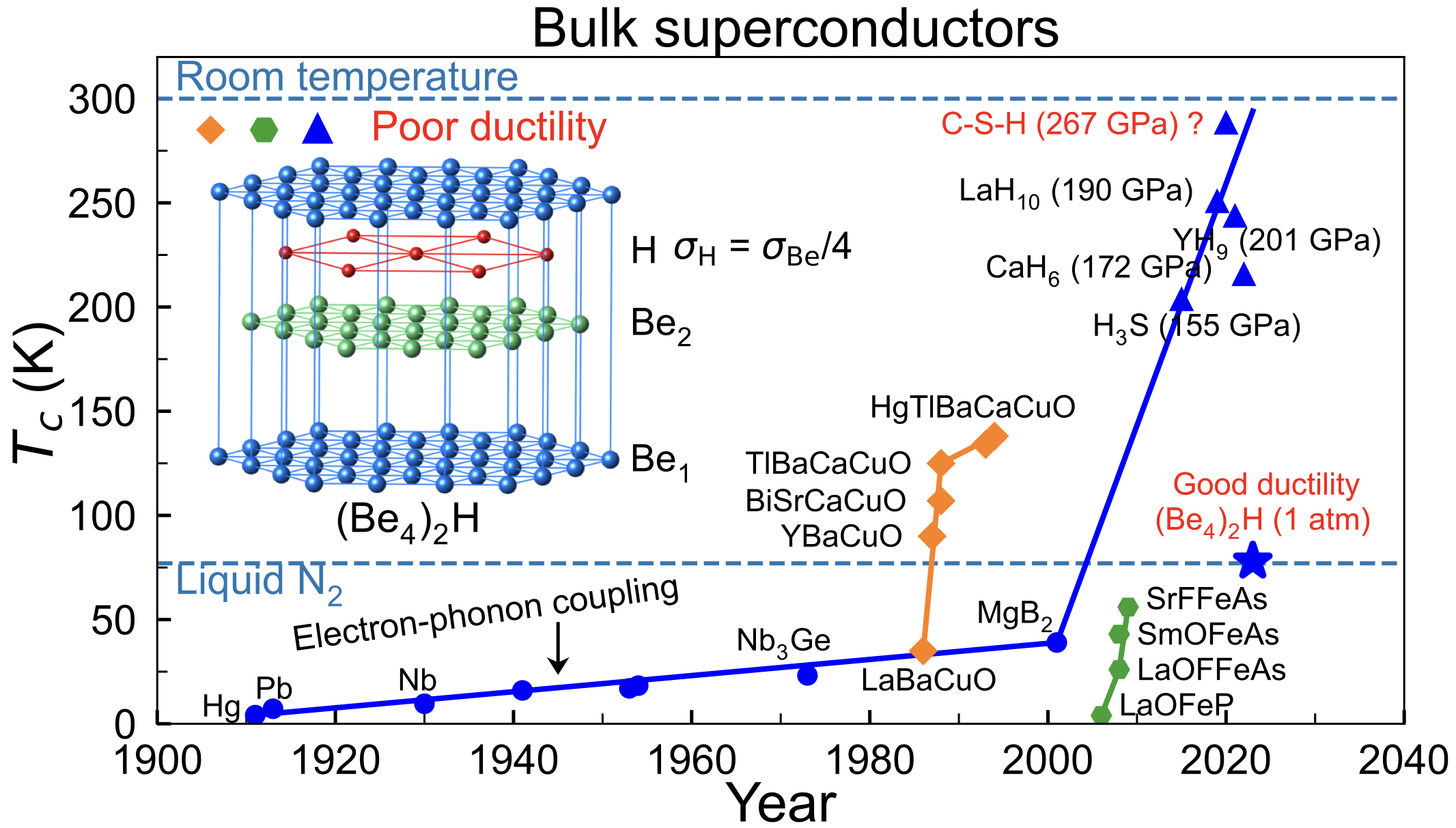 北京大学物理学院凝聚态物理与材料物理研究所、人工微结构和介观物理国家重点实验室史俊杰教授课题组提出了少氢金属键氢化物常压高温超导材料设计创新思想,取得重要进展,主要成果以标题“少氢常压延展性良好的(Be4)2H纳米超晶格的高温超导电性”(Few-Hydrogen High‑Tc Superconductivity in (Be4)2H Nanosuperlattice with Promising Ductility under Ambient Pressure)于2023年8月21日在线发表于《纳米快报》(Nano Letters)。