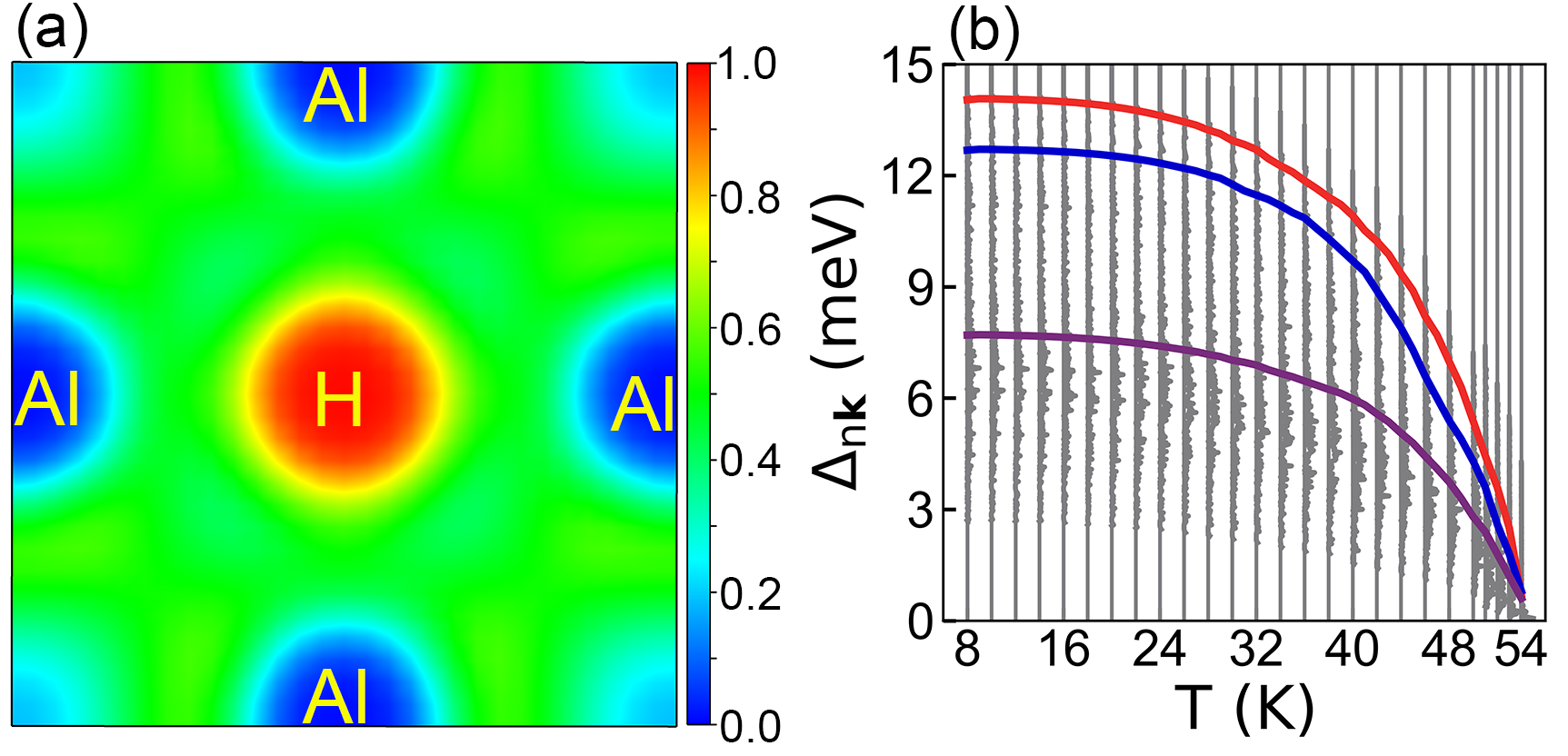 图3. 金属键钙钛矿Al4H 的 (a) 电子局域函数和 (b) 超导能隙随温度的变化关系。