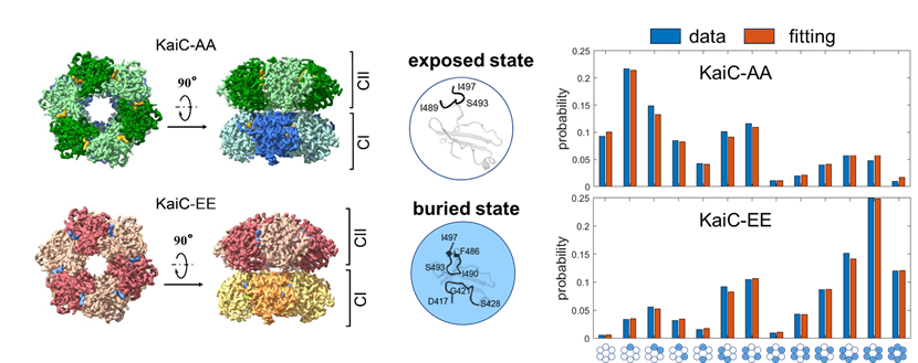 左图为KaiC-AA与KaiC-EE的电子密度示意图;中图为A-loop的两种构象;右图为KaiC-AA与KaiC-EE六聚体的A-loop构象分布的实验值和Ising模型的拟合值。