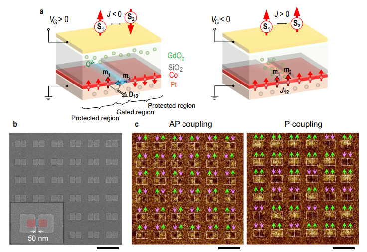 耦合纳米磁体系统示意图:a.电压调控反平行(左图)/平行(右图)耦合纳米磁体器件结构示意图; b. 耦合纳米磁体电子显微镜图;c. 耦合纳米磁体在反铁磁耦合(左图)铁磁耦合(右图)的磁力显微镜结果。