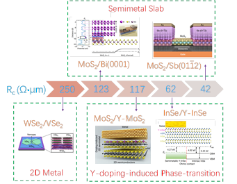 在金属-二维材料界面处常常形成金属诱导间隙态,从而产生高达103~106 Ω μm的接触电阻。如图4所示,近期的实验工作中,利用扩散掺杂相变、半金属接触、二维金属接触等方法,实现了接近量子极限的接触电阻,最低的接触电阻可以达到42 Ω μm。