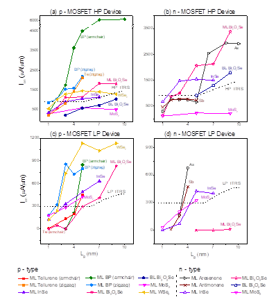 研究人员为了将二维场效应晶体管(2D FETs)缩小至极限尺寸,做出了巨大的努力,如图3所概括的。2016年,Desai等人首次实验实现了1纳米栅长的双层MoS2 FETs,显示出约10-9 mA μm-1的低漏电流,接近理想的65 mV/dec的亚阈值摆幅,以及约106的开关比。最近,清华大学的田禾课题组巧妙地利用了半金属单层石墨烯的边缘(0.34纳米)作为晶体管的栅极电极,实现了迄今最短的栅极长度(Wu, F., et al., Nature 2022)。其亚阈值斜率低至117 mV/dec,开关比达到1.02×105,漏电流小于10-9 mA μm-1,满足IRDS对低功耗逻辑器件的要求。