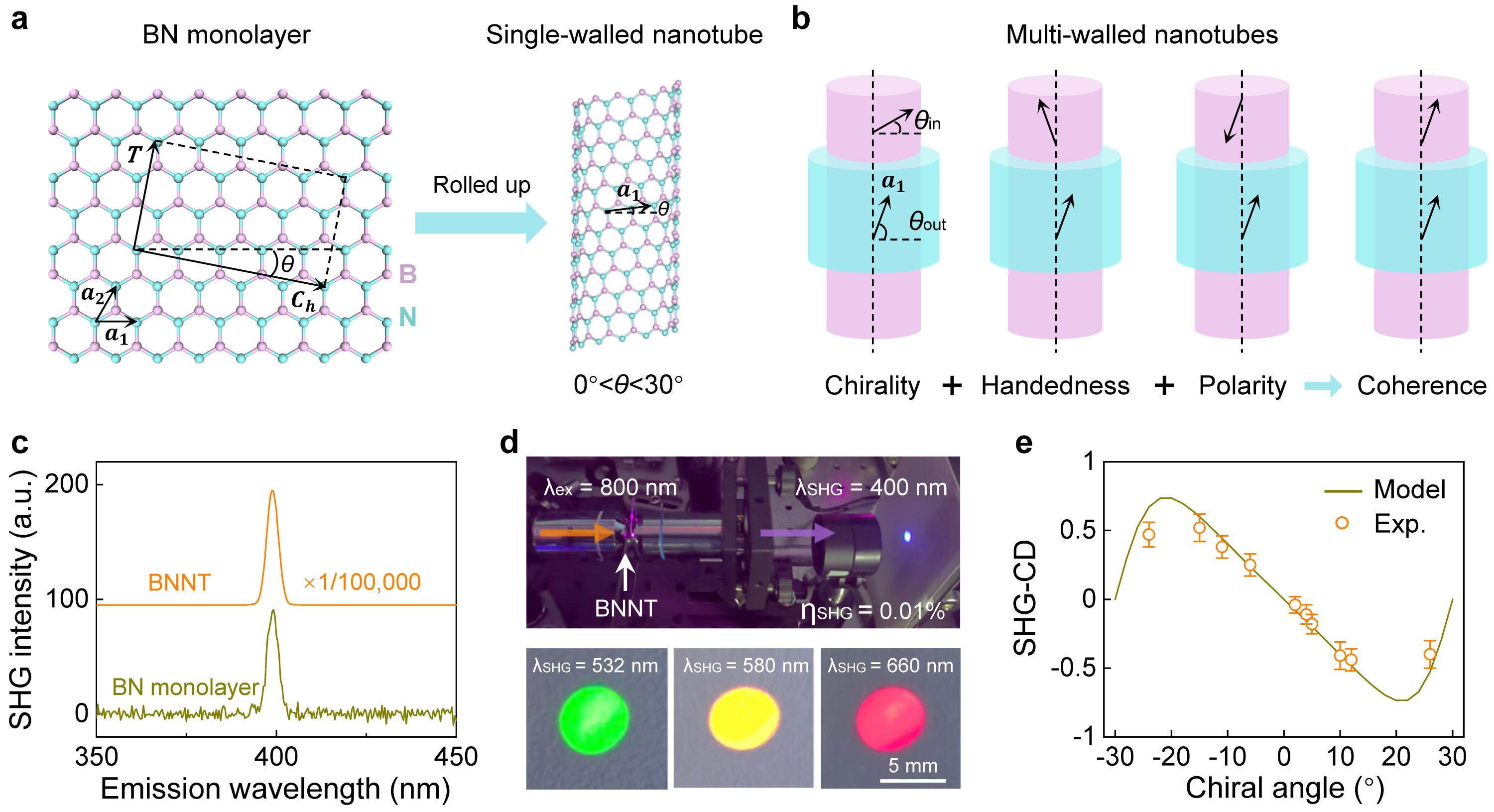 图1. a, 二维氮化硼卷曲成一维氮化硼纳米管的示意图。b, 相干堆垛的多壁氮化硼纳米管中管壁之间具有相同的手性、螺旋性和极性。c-e, 多壁氮化硼纳米管高效二次谐波输出(c-d)和连续可调二次谐波圆二色性(e)。