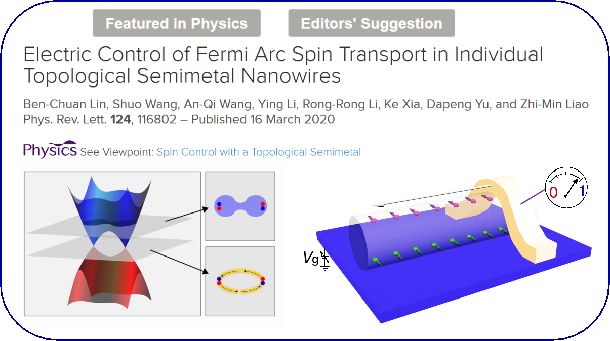 廖志敏课题组率先实验发现了狄拉克半金属Cd3As2中外尔费米子手性反常导致的负磁电阻效应【Nature Commun.6, 10137 (2015)】、Berry相位调制的表面态Aharonov-Bohm量子振荡【Nature Commun.7, 10769 (2016)】、拓扑表面态与体态的Fano量子干涉效应【PRL120, 257701 (2018)】、起源于拓扑表面态的量子霍尔效应【PRL122, 036602 (2019)】、拓扑半金属表面态的自旋输运特性以及自旋极化电流的栅压开关效应【PRL124, 116802 (2020)】。