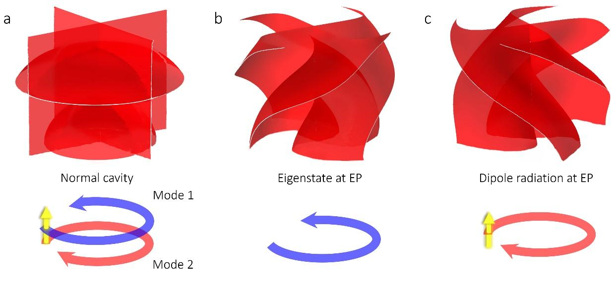 图1(a)普通环形谐振腔在一共振频率下有两个正交的本征态,处于共振频率的光源与其相互作用会同时激发出这两个本征态。(b)处于奇异点,共振频率上只存在一个逆时针传播本征态的环形谐振腔。处于共振频率的光源与其相互作用激发出了体系中不存在的顺时针传播的本征态。(c)环形谐振腔中本征态随着时间-宇称对称折射率调制的演化。在奇异点处两个本征态是完全平行的。 |
