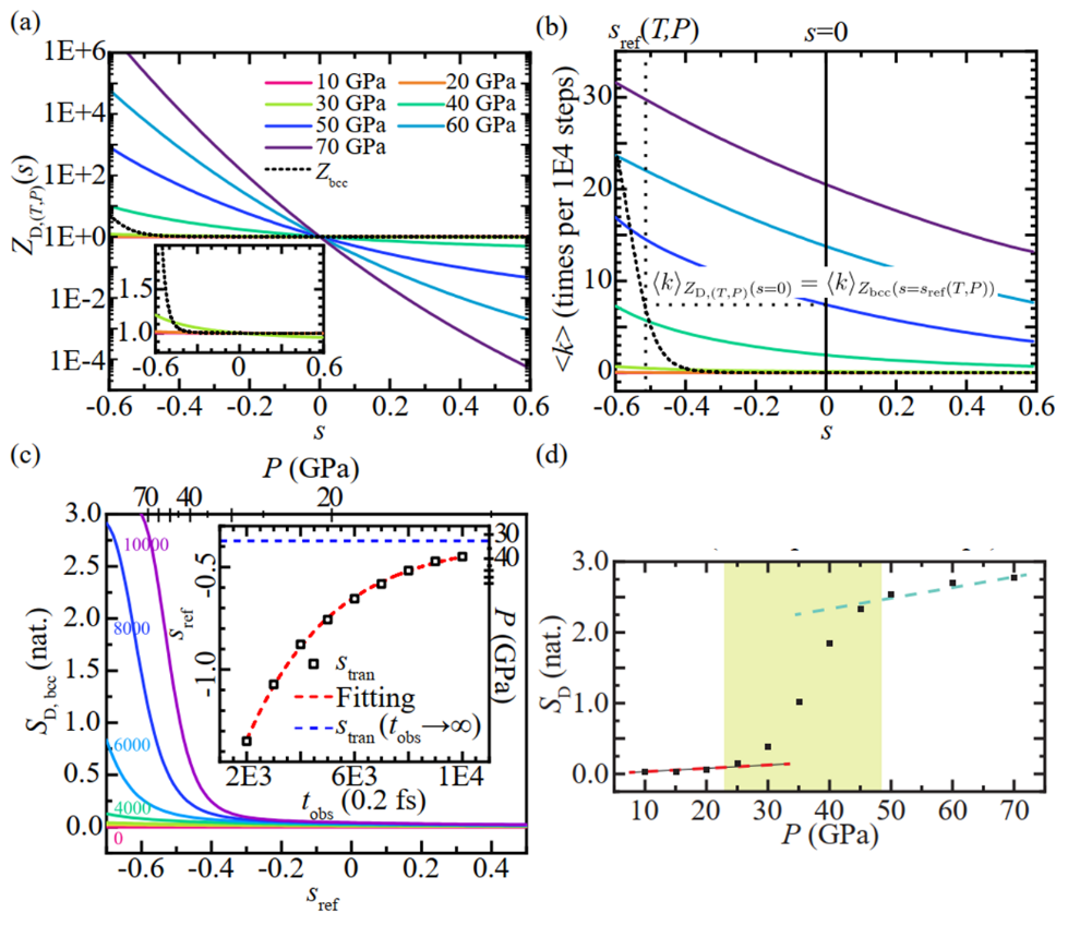 图2 (a)动力学配分函数zD(s);(b)各温度、压强下动力学场强度的标定方式;(c)由动力学场控制的动力学熵sD的曲线,随着模拟时长tobs增加,sD逐渐呈现出从右侧近乎于零到左侧快速增长的突变,将两侧曲线外延的交点定为临界点,子图为临界点随tobs变化的曲线;(d)由压强控制的动力学熵sD的曲线,呈现出在临界区域的缓变,该现象不会随着趋近热力学极限而消失