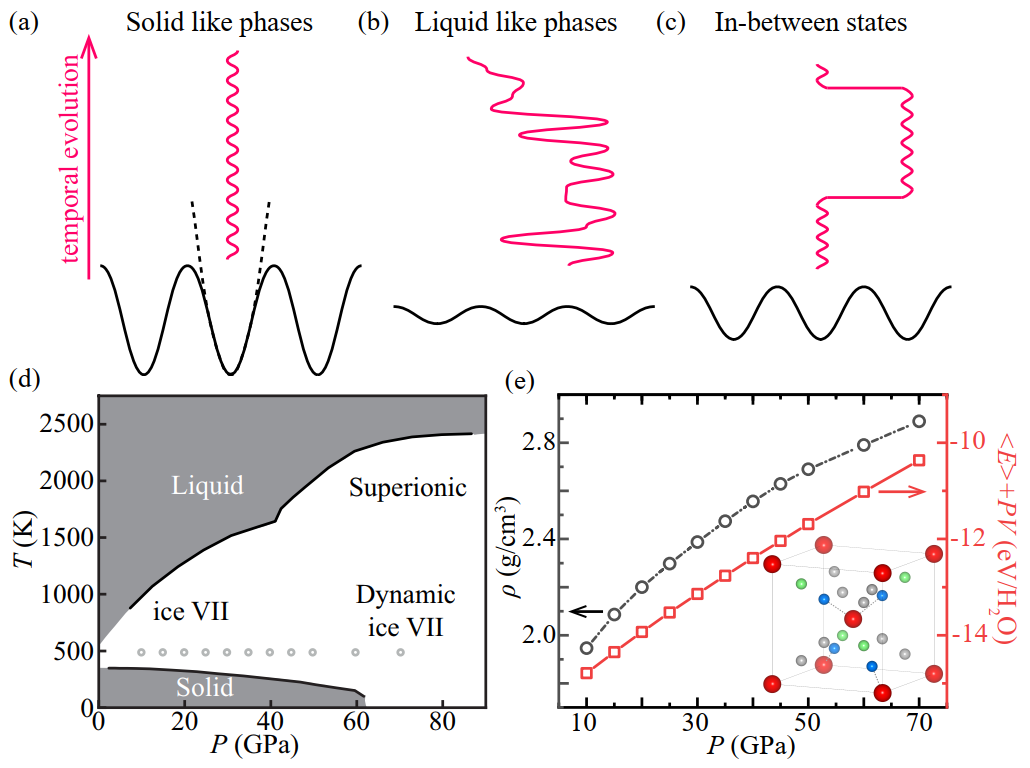 图1 相较于传统的原子束缚在平衡格点附近振动的固相(a)与原子自由在空间扩散的液相(b);事实上,凝聚态体系中还存在介于两者之间的新奇动力学相,例如(c),其静态结构接近于固相,但原子脱离格点束缚进行输运的稀有事件使其与固相不同。本工作选取高压冰相图(d)中空心点T=500 K进行研究,发现基于热力学理论的判据(e),密度与自由焓在5~70 GPa之间连续变化,无法揭示静态冰VII与动态冰VII的区别。