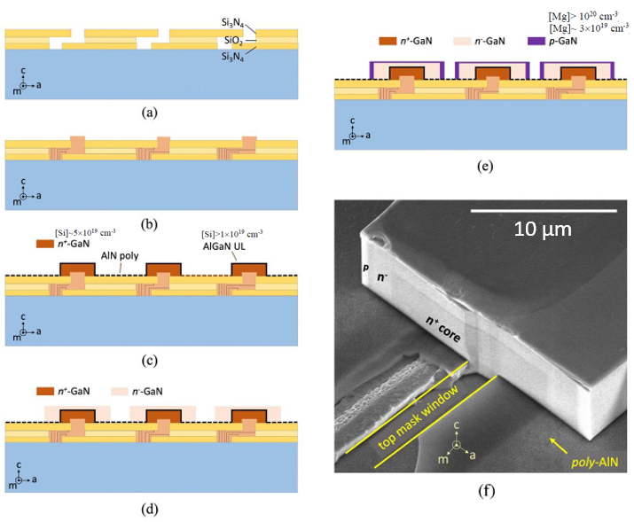 图1 (a)异质衬底上的蛇形通道掩膜;(b)GaN自通道中生长;(c)横向生长n+-GaN并生长AlGaN来引入AlN覆盖掩膜;(d)横向生长n--GaN;(e)对于PND,继续横向生长p-GaN;(f)扫描电镜图展示横向生长带来的矩形分层以及成功覆盖在掩膜上的AlN