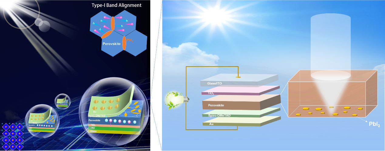 图1 PbI2与钙钛矿晶粒形成的自诱导I型能带排列(左)和光吸收(右)示意图