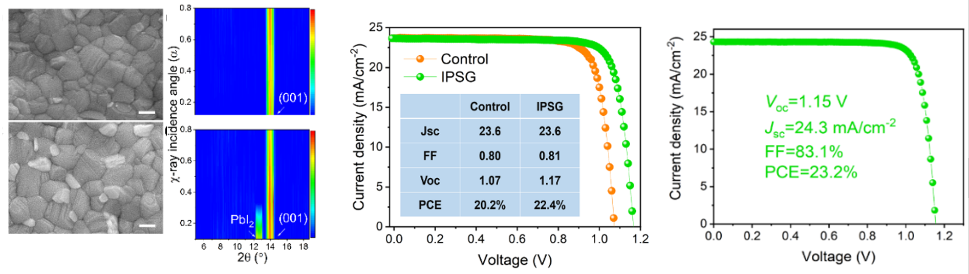 基于该方法,研究人员获得了载流子寿命超过2.5 μs的高质量钙钛矿薄膜,并将钙钛矿太阳能电池的开路电压从1.07 V提高到1.17 V。在一步法制备中将钙钛矿太阳能电池的能量转换效率从20.2%提升到22.4%,并在两步法制备中实现了23.2%的高能量转换效率(图2)。