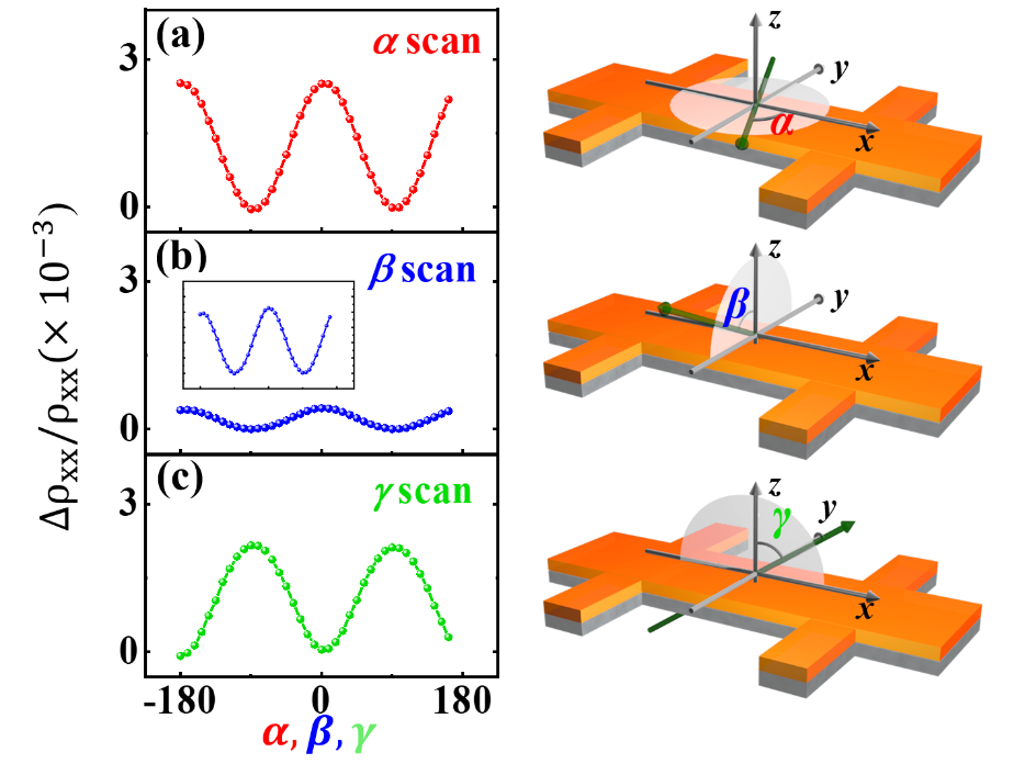 图1 (a)-(c) CuOx(3 nm)/Py(5 nm) 异质结构在三个旋转平面(α, β, γ) 内的磁电阻效应(300 K, 6 T),右图为霍尔结构示意图以及旋转角度的定义(其中, γ 平面内的磁电阻为各向异性磁电阻效应,β 平面内的磁电阻为轨道 Rashba-Edelstein 磁电阻效应,α 平面内的磁电阻为 β 与 γ 平面内磁电阻效应之和)