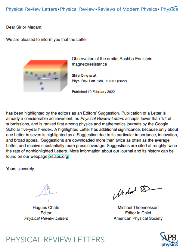 2022年2月10日相关成果以“轨道Rashba-Edelstein磁电阻的观测”(Observation of the Orbital Rashba-Edelstein Magnetoresistance)为题,在线发表于《物理评论快报》(Physical Review Letters),并被选为编辑推荐文章(Editors’ Suggestion)。北京大学物理学院2016级博士研究生丁石磊(现为苏黎世联邦理工学院博士后)、2019级博士研究生梁中宇和德国于利希研究中心博士后Dongwook Go为共同第一作者,杨金波教授为通讯作者。