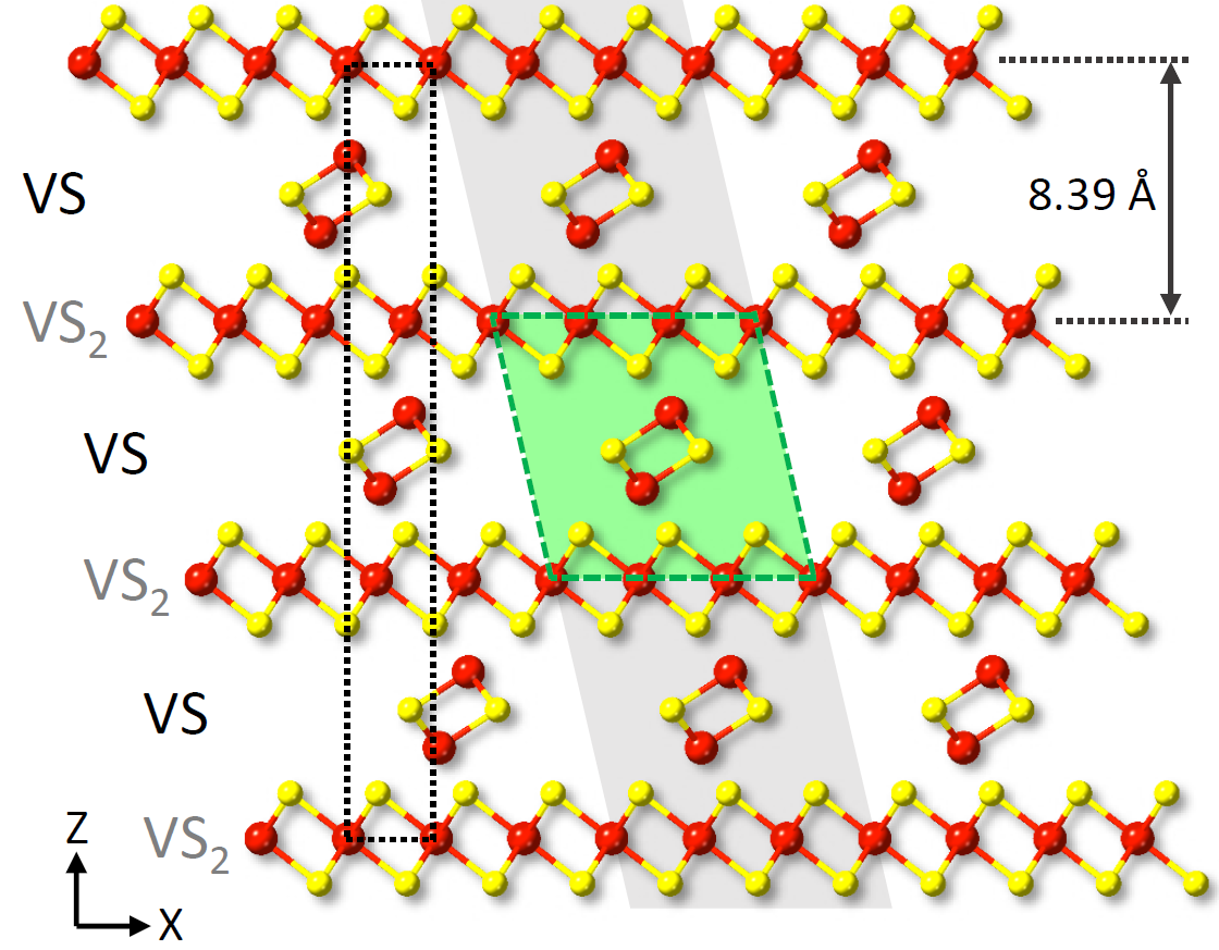 近日,北京大学物理学院凝聚态所、人工微结构和介观物理国家重点实验室、纳光电子前沿科学中心吴孝松研究员与北京理工大学物理学院周家东、姚裕贵教授,日本大阪大学Kazu Suenaga教授,新加坡南洋理工大学刘政教授等合作,合成了一种硫钒化合物(分子式为V5S8),并系统研究了其结构和电输运性质。他们发现,当磁场B在样品平面内时,这种材料表现出有悖于人们直觉的面内霍尔效应。进一步的透射电子显微镜结构分析揭示出,该材料具有新型的超晶格结构,即由二维VS2原子晶体和一维VS原子链阵列交替堆叠而成(图1);此异维结构有别于由不同材料的二维薄膜堆叠而成的传统超晶格结构,为未来超晶格材料开辟了新的设计思路。
