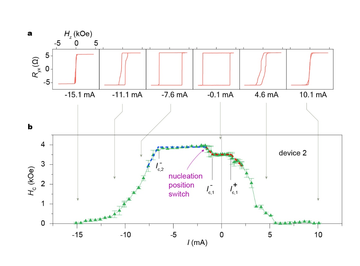 通过设计不同电极形状的样品,发现该电流调制效应的对称性与常见的热效应、SOT、奥斯特场等均不相同,但是与电流产生STT辅助畴壁运动进而改变矫顽场的模型定性相符(图2)。