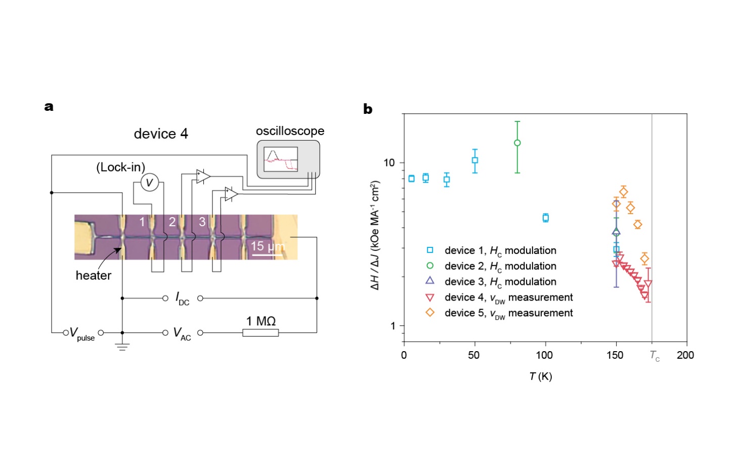 图3 a,Co3Sn2S2纳米线器件进行畴壁迁移率测量的示意图; b,不同样品和实验方法测得的STT效率