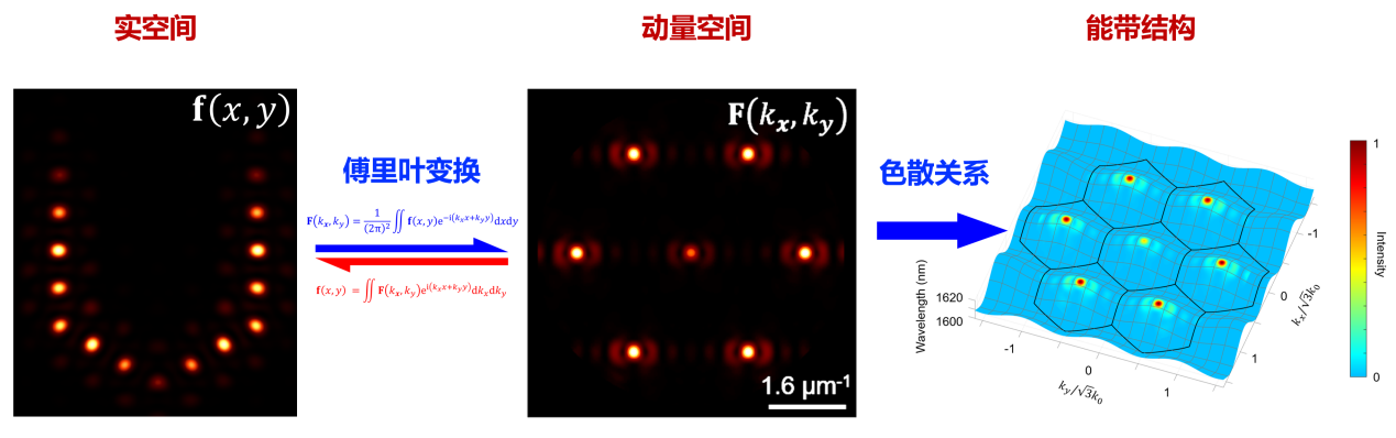图2. 莫尔平带的本征能量简并特性使得任意形状纳米激光阵列的相干激射成为可能。纳米激光阵列的实空间和动量空间电场强度分布由傅里叶变换相互联系,动量空间分布通过能带结构对应出频率分布,莫尔平带保证了频率的简并性。
