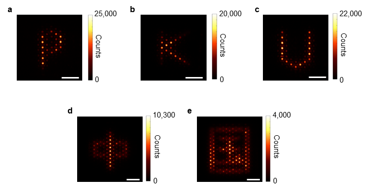 图3. 莫尔纳米激光阵列以“P”、“K”、“U”和“中”、“国”图形生成阵列化相干激射。由于莫尔平带的本征能量简并特性,任意形状的莫尔纳米激光阵列均能够通过自发相位锁定产生相干激射。