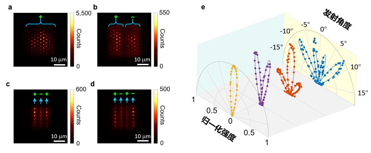 图5. 相控阵纳米激光阵列。(a-d)基模(a)、一阶模(b)、二阶模(c)、三阶模(d)的实空间激射图案,标“+”和“−”的纳米激光之间相差180度的相位;(e)基模、一阶模、二阶模、三阶模中心Г点的角分辨强度分布图。