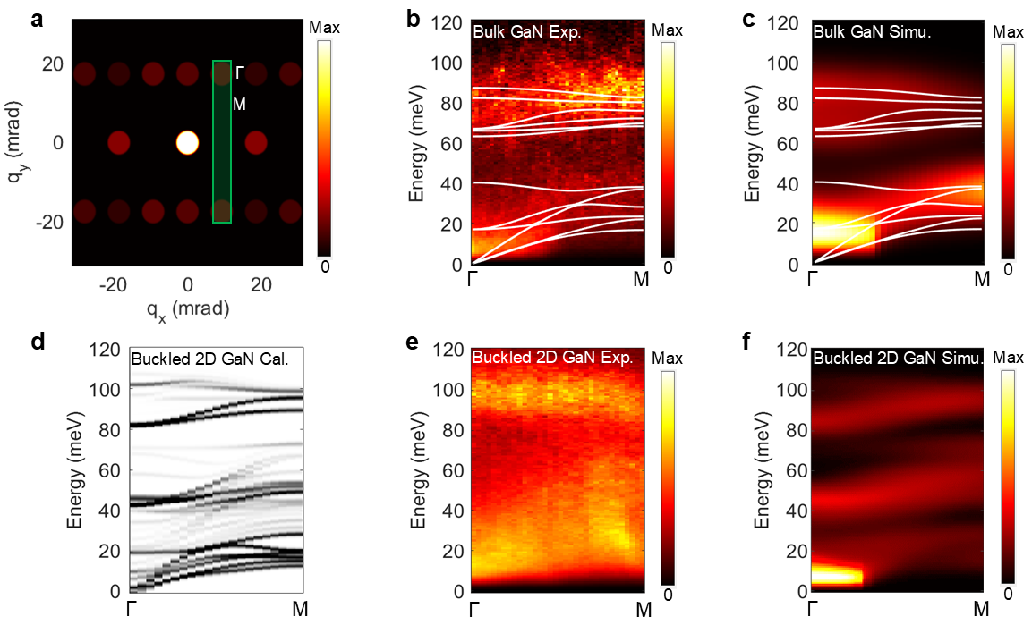 图1.体GaN与褶皱2D GaN的声子色散。(a)EELS光阑在衍射面的摆放示意图。绿色矩形框标示了EELS光阑的位置,旁边标注了选取的动量路径。(b)体GaN的声子色散,白色线为计算的体GaN声子色散曲线。(c)体GaN声子色散的模拟结果,白色线为计算的体GaN声子色散曲线。(d)褶皱2D GaN投影声子色散的计算结果。(e)(f)实验和计算褶皱2D GaN的声子色散。