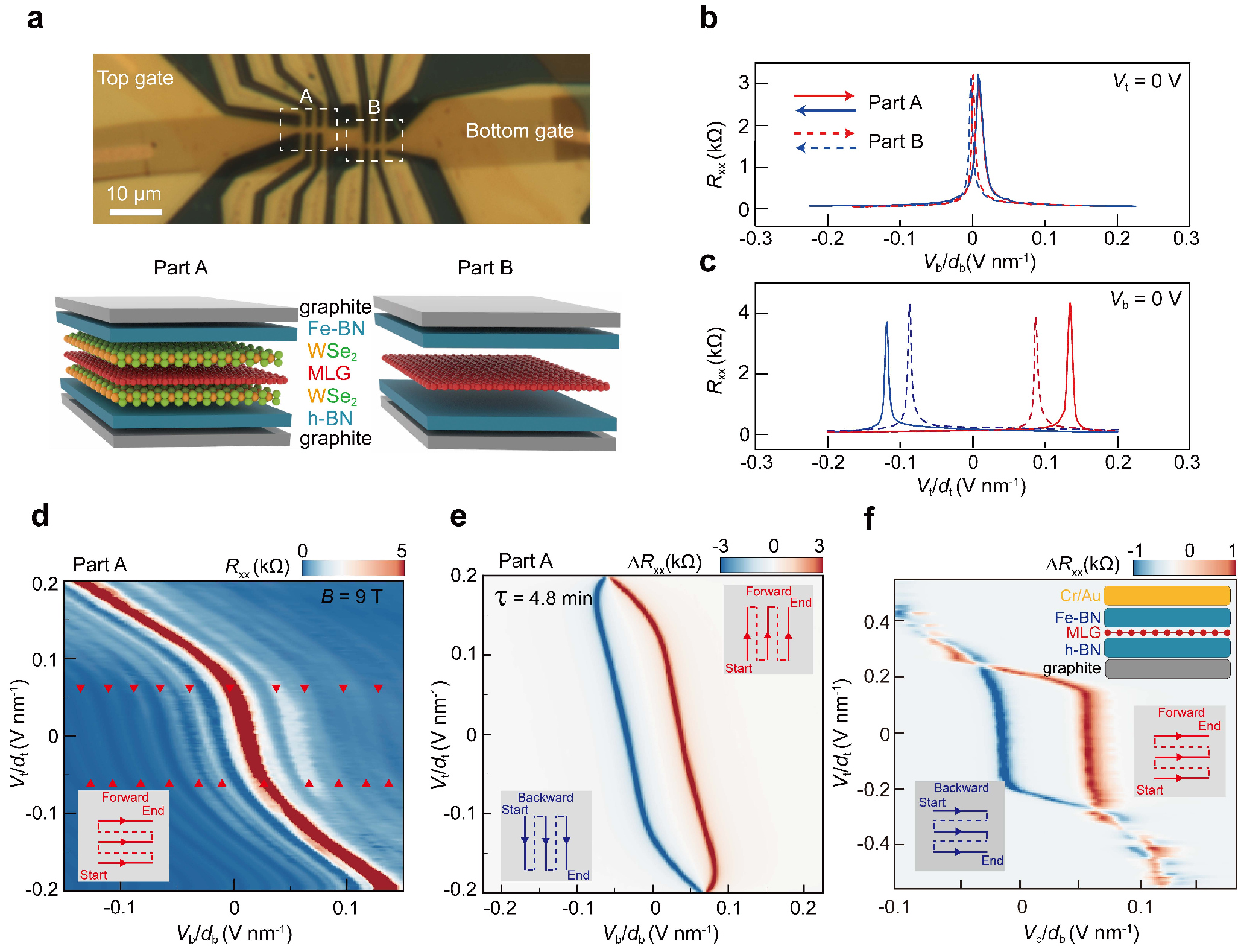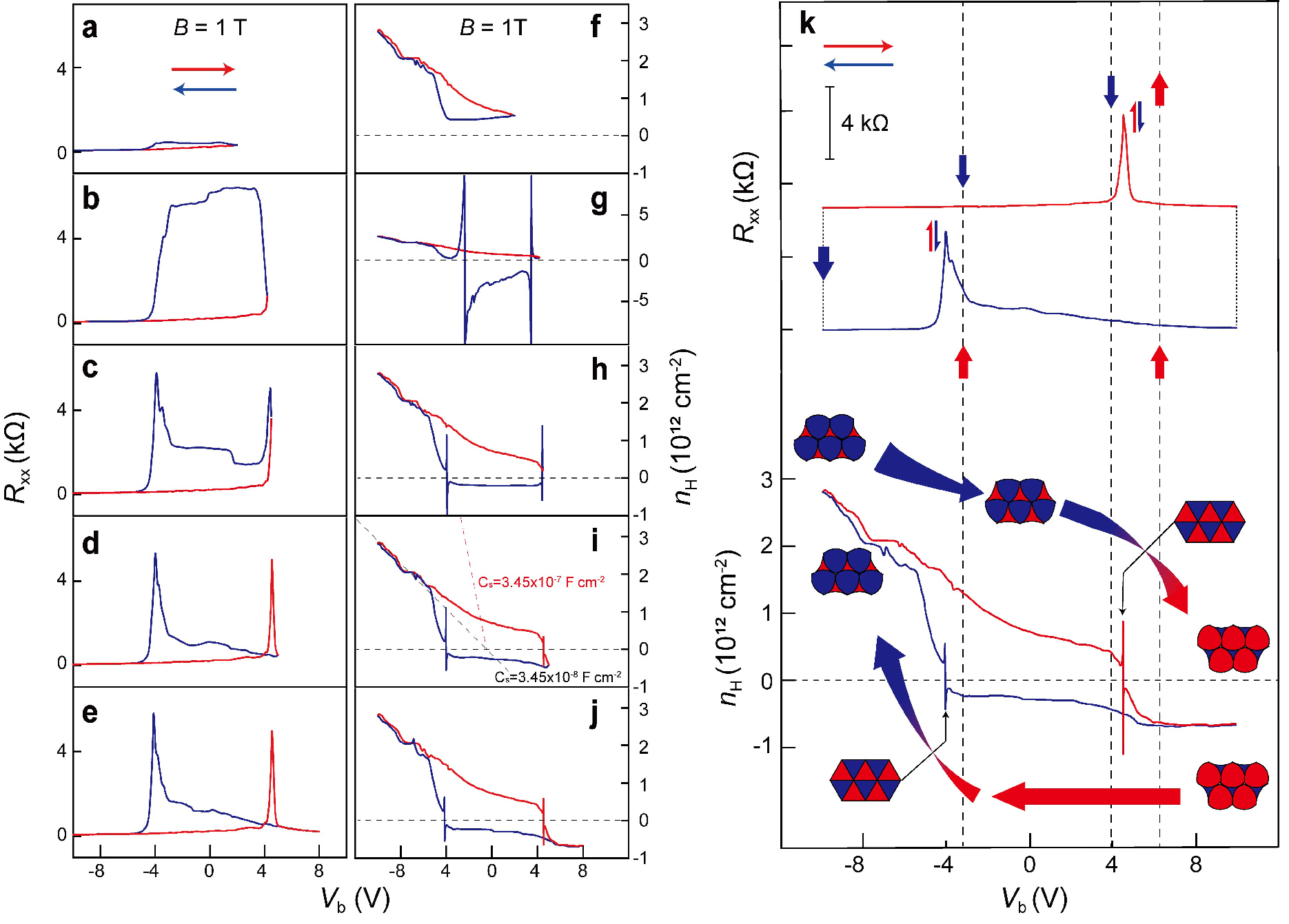 图3 栅极调控过程中的“惯性”行为,与瞬时响应的电子行为相悖,预示着器件中存在晶格移动。右图展示了不同晶格堆叠极化态与石墨烯电阻之间的对应关系。