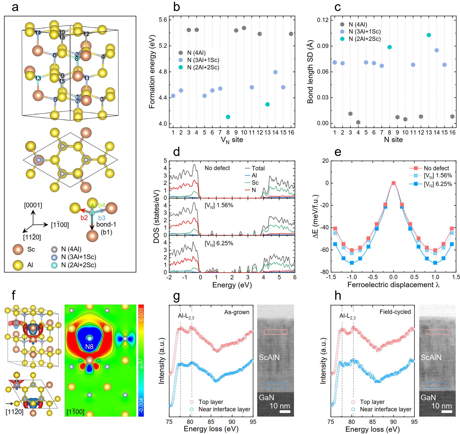图5. 铁电ScAlN中应变、氮空位和极化翻转势垒之间的联系。