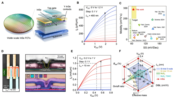 北京大学物理学院凝聚态物理与材料物理研究所刘开辉教授课题组与合作者提出“固–液–固”材料制备新策略,首次实现了高质量二维硒化铟(InSe)半导体晶圆的制备。该材料展现出优异的电学性能,在晶体管阵列中实现了极高的迁移率与接近玻尔兹曼极限的亚阈值摆幅,并在超短沟道(10 nm以下)器件中,其关键参数—包括工作电压、栅极长度、漏致势垒降低(DIBL)、电子有效质量、开/关比和室温弹道率等,全面优于目前最先进的英特尔3纳米节点技术。2025年7月18日,相关成果以“用于集成电子学的二维硒化铟晶圆”(Two-dimensional indium selenide wafers for integrated electronics)为题,在线发表于《科学》(Science)。