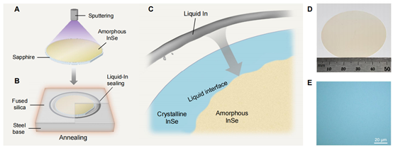 针对上述挑战,研究团队创新性地提出“固–液–固”二维InSe半导体制备策略,成功攻克了晶圆级InSe材料纯相、高质量制备的关键难题。具体而言,研究团队首先通过磁控溅射技术,在蓝宝石衬底上沉积非晶InSe薄膜,确保前驱体化学计量比为1:1。随后,在高温下(~550 ℃),利用低熔点液态In(熔点约157 ℃)包覆晶片边缘,结合熔融石英构建液封空间,防止成分挥发。另外,液态In高温下,少量In原子进入固态InSe非晶薄膜,形成富In液态界面。在该密闭反应体系中,非晶InSe在富In液态界面发生溶解–再结晶过程,促进高结晶度、纯相InSe晶膜的形成。最终,团队制备出厚度均匀、相结构单一、晶体质量优异的2英寸InSe晶圆。