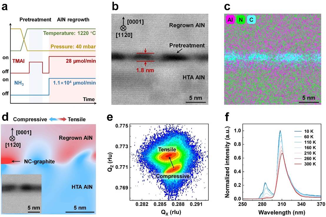 图a:MOCVD原位金属源预处理示意图,图b:AlN模板的截面HAADF-STEM图像,图c:AlN模板的EDS图像,图d:HAADF-STEM图像的几何相分析结果,图e:AlN模板的XRD倒空间mapping结果,图f:波长310 nm多量子阱有源区的内量子效率(变温PL)测试结果。