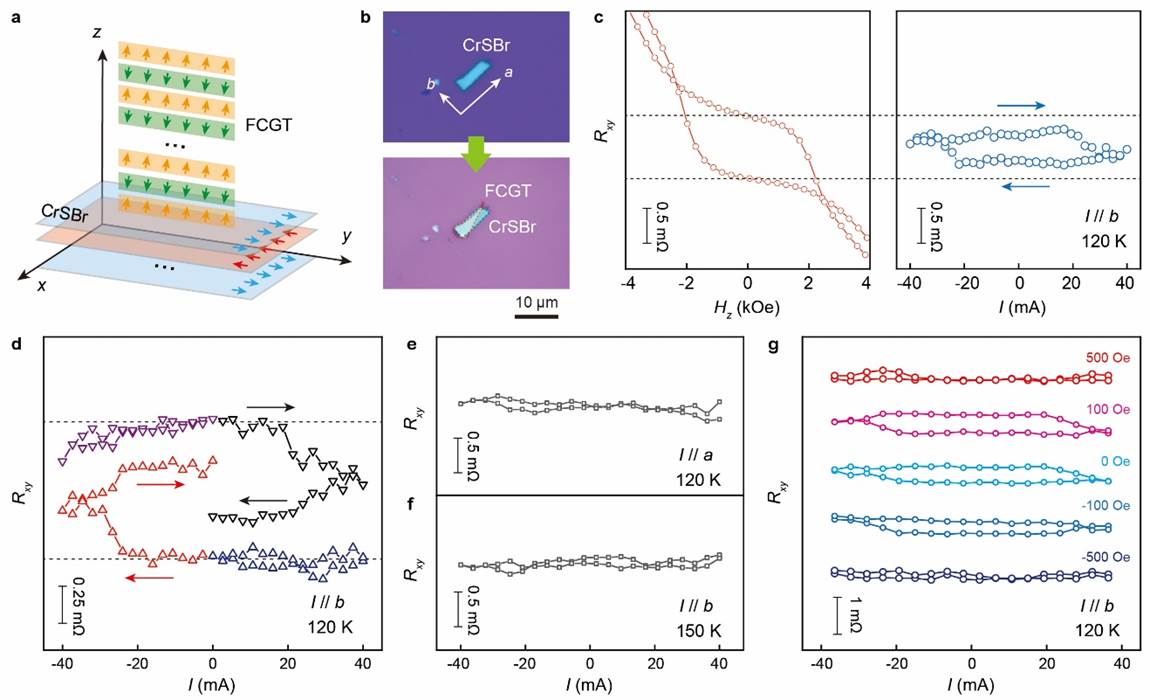此外,研究团队通过构筑全范德华、全反铁磁异质结构(FCGT/CrSBr),利用二维反铁磁体界面耦合产生的非共线自旋织构打破体系的镜面对称性,进一步实现了奈尔矢量的零磁场翻转。