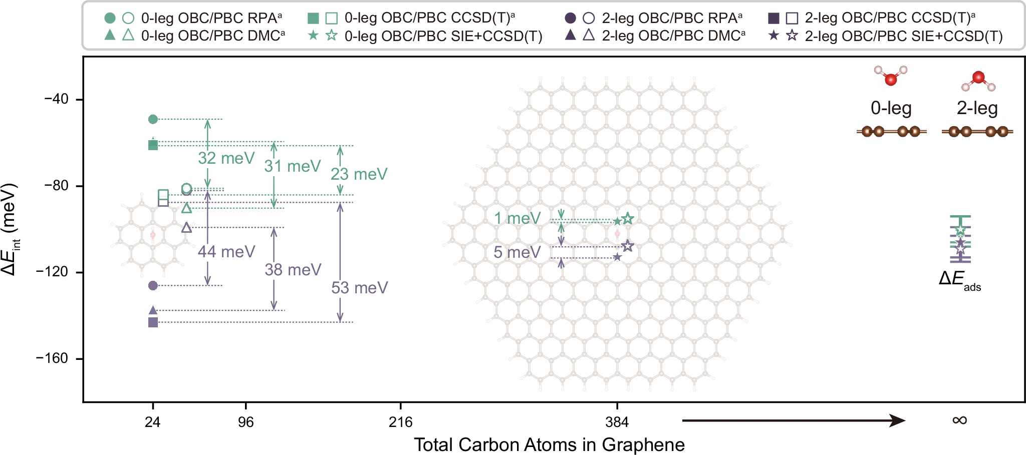 水分子与石墨烯的相互作用长期以来是表面科学的一个悬而未决的问题,不同研究得出完全相反的结论:有的认为水倾向“趴着”更加稳定,有的认为“竖着”吸附更加稳定。借助 SIE+CCSD(T),研究团队系统地比较了不同水分子取向下的吸附能,发现在小体系下,模拟结果会因边界条件不同而出现巨大差异,而前人的工作中因为缺乏有效计算工具无法再进一步扩大体系尺寸来消除“小体系”的影响。得益于SIE+CCSD(T)的高效性,团队发现当体系扩大到数百原子级别时,开放性与周期性模型的结果逐渐趋同,差距缩小到仅几 meV。最终得到不同取向下的吸附能几乎相同,约为 100 meV。该计算澄清了单个水分子在石墨烯上吸附的基态构型的争论,这将对研究水在石墨烯表面的运动规律提供重要的理论参考。