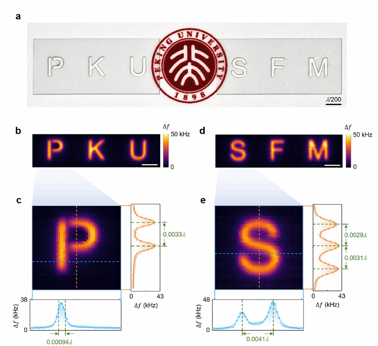 依托独角鲸波函数的极端局域特性,课题组进一步发展了新型近场扫描显微技术——奇点光学显微镜。实验实现 λ/1000 的空间分辨率,并成功对任意深亚波长结构(如 “PKU” 与 “SFM” 图案)完成高分辨扫描成像(图3),展示了其在超分辨光学检测和成像方面的潜在应用。