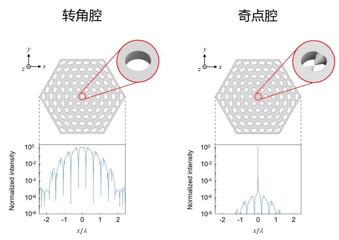 图2:转角谐振腔和奇点介电谐振腔光场分布的对比。