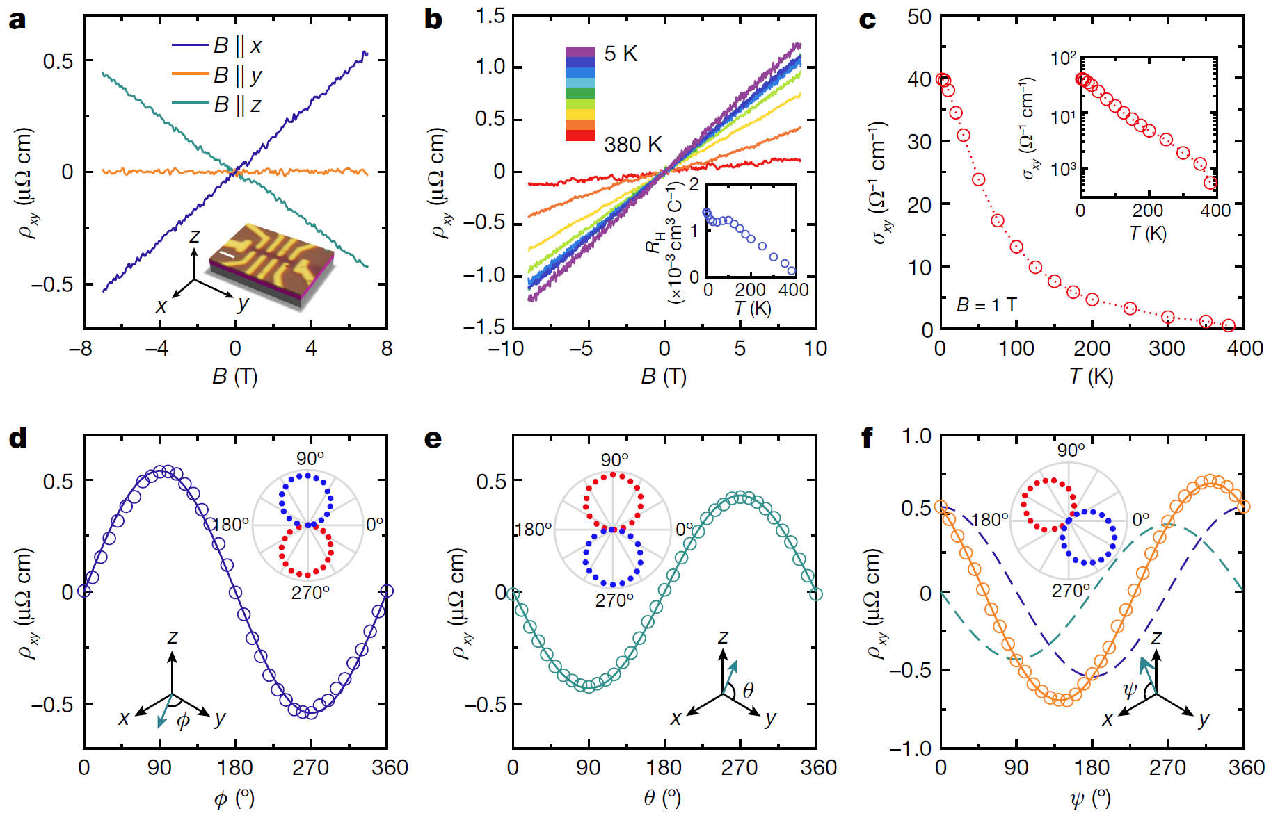 在正常霍尔效应中,施加的外电场E在样品测量平面内,而磁场B垂直于样品平面,产生的霍尔电流JH在样品平面内,且方向和电场垂直;这三个矢量两两垂直的关系源于载流子所受到的洛伦兹力F=ev×B。在反常霍尔效应中,磁场B被磁化强度M替代,也满足JH∝E×M这样的两两垂直关系。因此,当磁场B或者磁化强度M在样品平面内时,通常不存在霍尔效应。