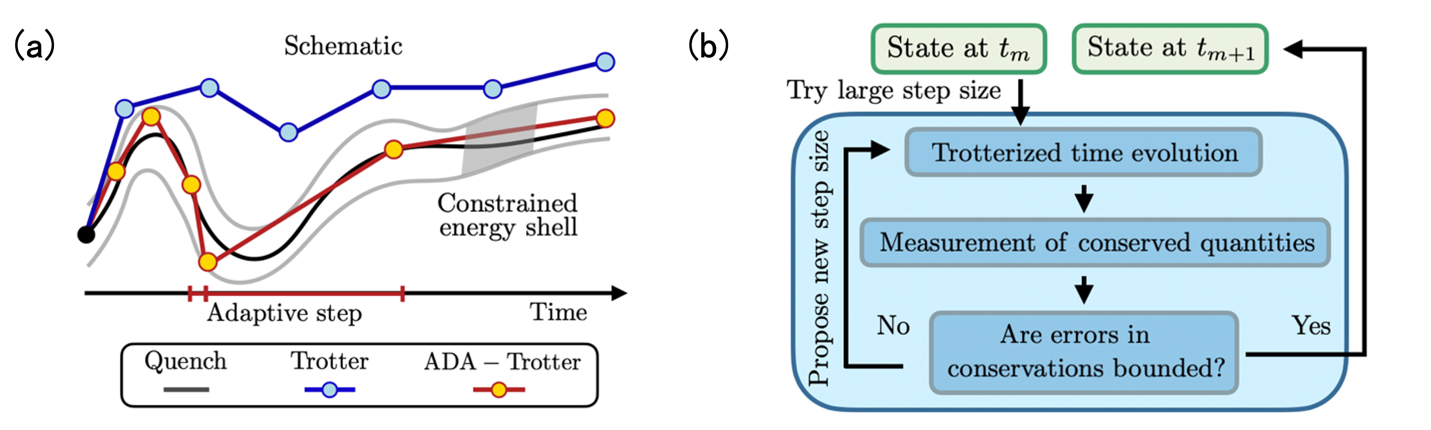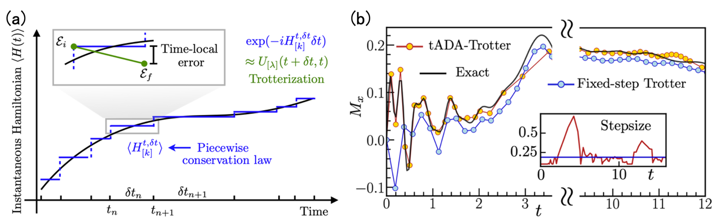 图2 :(a)tADA-Trotter的示意图。将哈密顿量的时间变化离散化,利用分段守恒定律调整Trotter演化步长。(b)自适应算法与固定步长算法的对比。